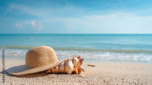 Summer Relaxation at the Beach with a Straw Hat and a Seashell on the Sandy Shoreline