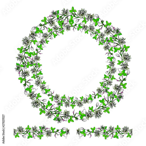 summer, round double frame with space for text. Flowers and clover leaves, painted, green, pink and white. Clover for luck.T rifolium repens. seamless clover brush
