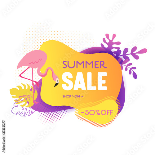 Summer sale banner template. Liquid abstract geometric bubble with tropic flowers and flamingo, Tropical background and backdrop, Promo badge for seasonal offer, promotion, advertising. Vector