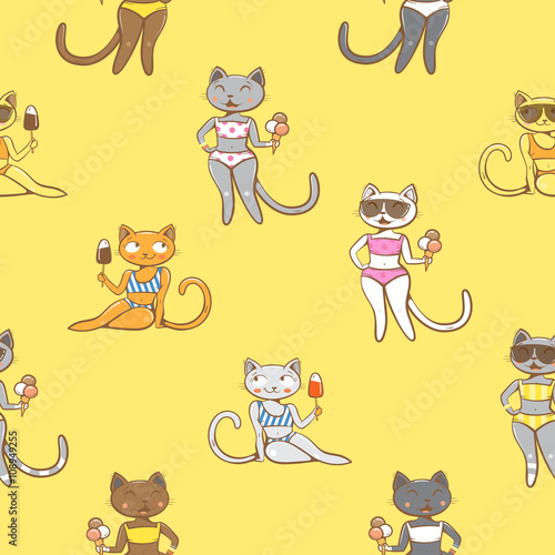 Summer seamless pattern with cats in bikini and sunglasses. Cute cartoon cats on the beach eating ice cream. Vector image.