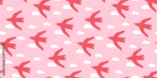 Summer seamless pattern with seagulls and clouds in flat design. Modern geometric vector illustrations. Trendy background for poster, card, banner, printing on fabric.
