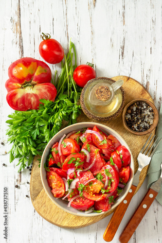 Summer snack or lunch. Fresh tomato salad with onions, herbs and olive oil on a white wooden table. Top view flat lay background. Copy space.
