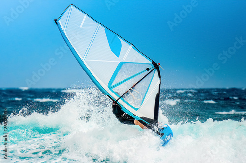 summer sports: windsurfer riding the waves during the holidays with the white sail on the atlantic blue ocean water.