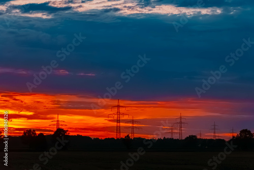 Summer sunset with a dramatic sky and overland high voltage lines near Tabertshausen, Deggendorf, Bavaria, Germany