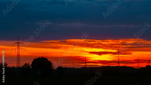 Summer sunset with a dramatic sky and overland high voltage lines near Tabertshausen, Deggendorf, Bavaria, Germany