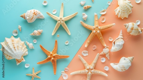 Summer time concept Flat lay composition with beautiful starfish and sea shells on colored table top view : Generative AI