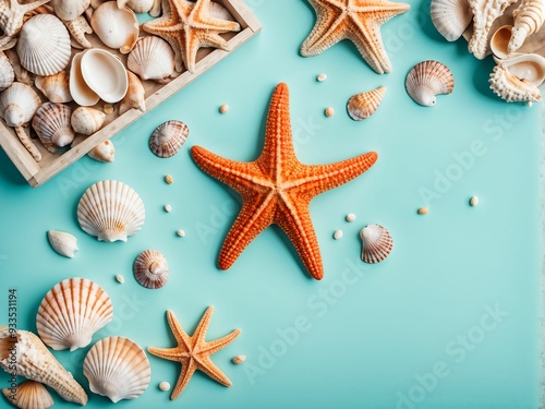 Summer time concept Flat lay composition with beautiful starfish and sea shells on colored table, top view.