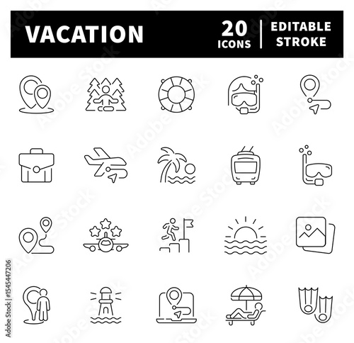 Summer vacation and holiday vector icons. vacation, recreation, leisure, travel, entertainment, relax, relaxation icons