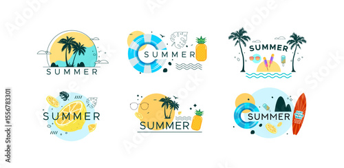 Summer vacation collection in flat design style with beach elements like sun, sea, surfboard, and pineapple. Ideal for travel agencies, seasonal banners, Perfect for summer events, summer holidays