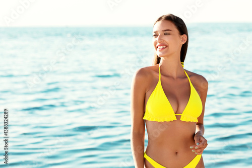 Summer Vacation Concept. Lady In Swimwear Standing On Beach Sunbathing Near Sea Looking Aside. Blank Space For Text