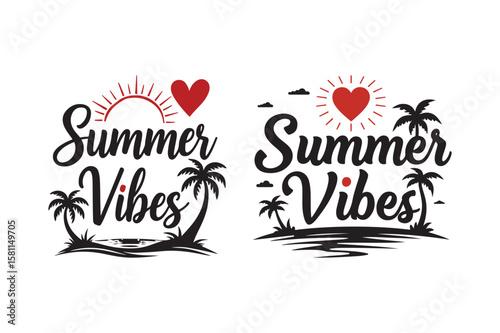 Summer vibes text with palm trees and hearts