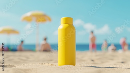 Summer Vibes: Vibrant Yellow Thermo Water Bottle at Sunny Beach with Playful Children in Sand - Ultra-Detailed Photography of Seasonal Nostalgia