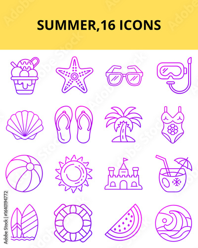 Summer-themed icons collection featuring beach, sun, and leisure