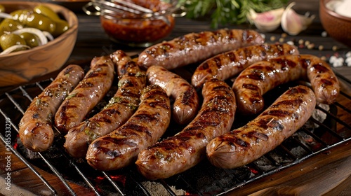 Sumptuous barbecue dinner with grilled sausages and delicious ingredients on table
