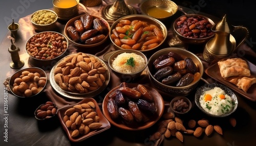 Sumptuous Spread Of Traditional Arabic Food Served During Ramadan Featuring Dates and Almonds
