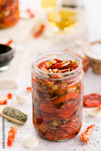 Sun dried tomatoes on white bowl, white wooden background. Dried tomatoes with olive oil, salt, herbs and garlic recipe. Top view, copyspace.