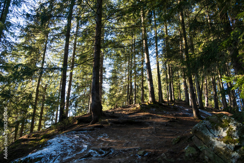 Sun in the forest. Forest in the mountains. Pine trees. Tall trees. Sun rays. Pine branch. Close-up. Bright colors. View from below. Winter. Warm weather. Mountains. Forest. Snow. Fir tree