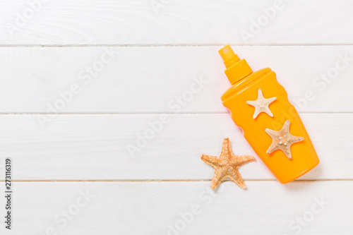 sun protection cream bottles with seashells on white wooden table with copy space. Travel healthcare accessories top view