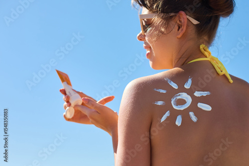 Sun Protection. Sun Cream. Skin and Body Care. Woman Applying Sunscreen Tanned Shoulder In Form Of The Sun. Girl Putting Sun Cream on The Skin.