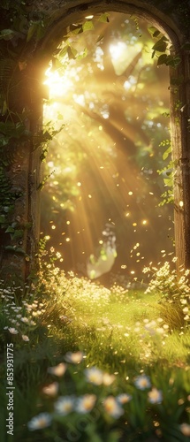 Sun rays illuminating a meadow with flowers and green grass, featuring a mythic magical gate, in a warm light fantasy concept, minimalist