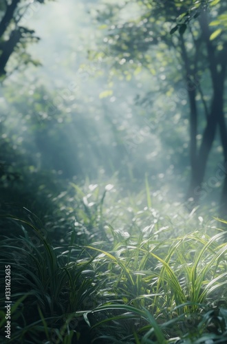 Sun Rays Shining Through Forest Trees and Green Grass Plants