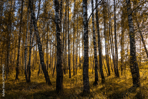 Sun setting through birch tree forest. Golden light illuminating autumn landscape in grove. Natural scenic view for wallpaper design. Sunset in grove.