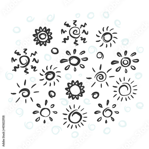 sun with sunburst hand drawn set in doodle sketch style. collection of suns drawn by brush strokes free hand.