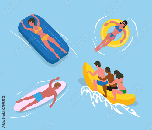 Sunbathing women on rubber circle or inflatable mattress, man lying on surfboard, people sitting on water banana, summer activity in ocean vector