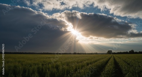 Sunbeam shining through break in clouds over field