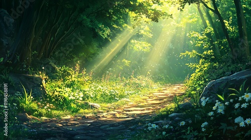 Sunbeams illuminate a forest path.