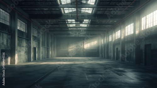 Sunbeams illuminate a large, empty, grunge industrial warehouse interior.