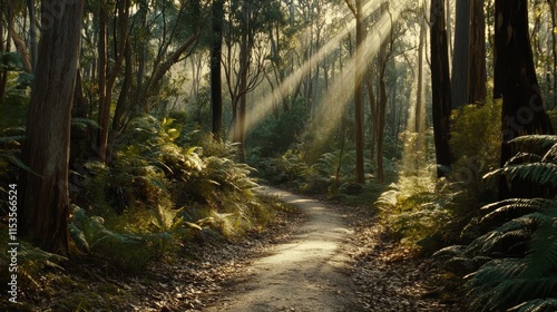 Sunbeams illuminate a path winding through a lush, green forest with ferns and tall trees.