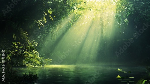 Sunbeams illuminate jungle pond, lush foliage backdrop, peaceful scene