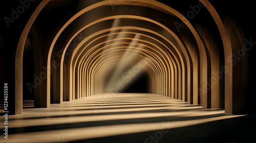 Sunbeams illuminate long arched hallway, architectural design, interior perspective, background dark