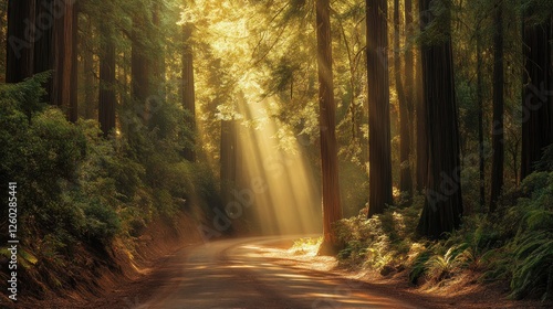 Sunbeams illuminate Redwood forest road