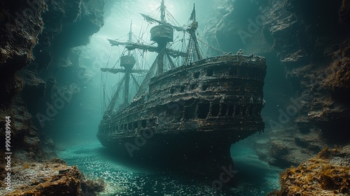 Sunbeams Illuminate Sunken Shipwreck in Underwater Cave