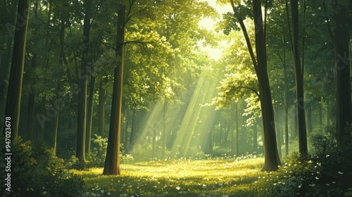 Sunbeams Illuminating a Forest Clearing with White Flowers
