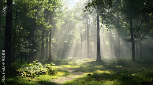 Sunbeams illuminating misty forest path with light filtering through trees for evoking peaceful solitude natural wonder and serene atmosphere in tranquil woodland concept.