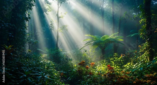Sunbeams pierce a lush, misty rainforest, illuminating vibrant green foliage and tree trunks.