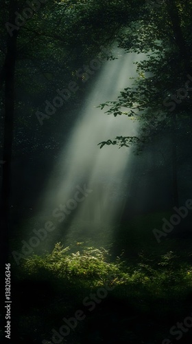 Sunbeams pierce a misty forest, illuminating lush green undergrowth. A magical, ethereal scene.
