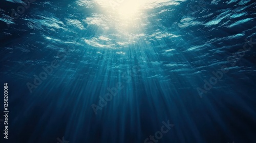 Sunbeams pierce deep ocean; tranquil underwater scene; marine background; nature imagery