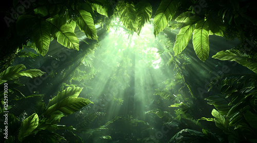 Sunbeams pierce lush rainforest canopy, dappled light on jungle floor, nature background
