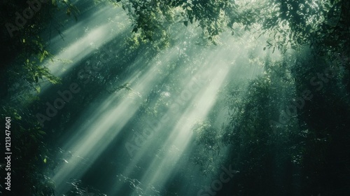 Sunbeams Piercing Through the Emerald Canopy: A Mystical Forest Scene