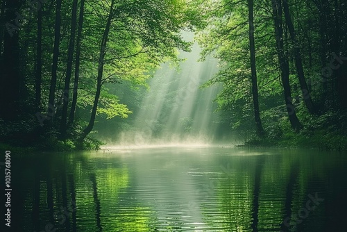 Sunbeams Shining Through Dense Forest Canopy, Illuminating Still Water