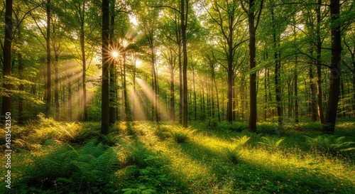 Sunbeams stream through a lush green forest illuminating ferns and undergrowth, creating a magical, serene natural scene.