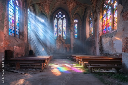 Sunbeams Through the Stained Glass: A breathtaking light show illuminates a forgotten church, showcasing the vibrant stained glass windows. The image evokes feelings of peace, tranquility