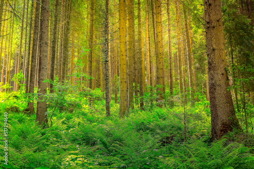 Sunbeans between pine woodland trunks near Salzburg, Austria