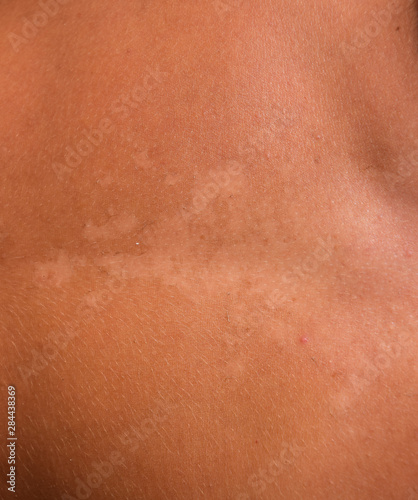Sunburn on the skin of the stomach. Exfoliation, skin peels off. Dangerous sun tan