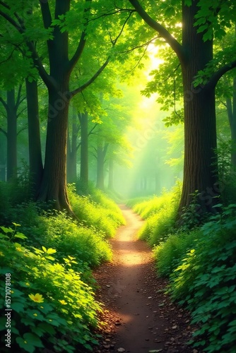 Sun-Dappled Forest Path A Magical Summer Hike Through Lush Green Foliage
