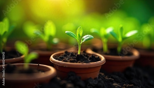 Sun-Dappled Seedlings Thriving in Terracotta Pots A Vibrant Spring Vegetable Garden